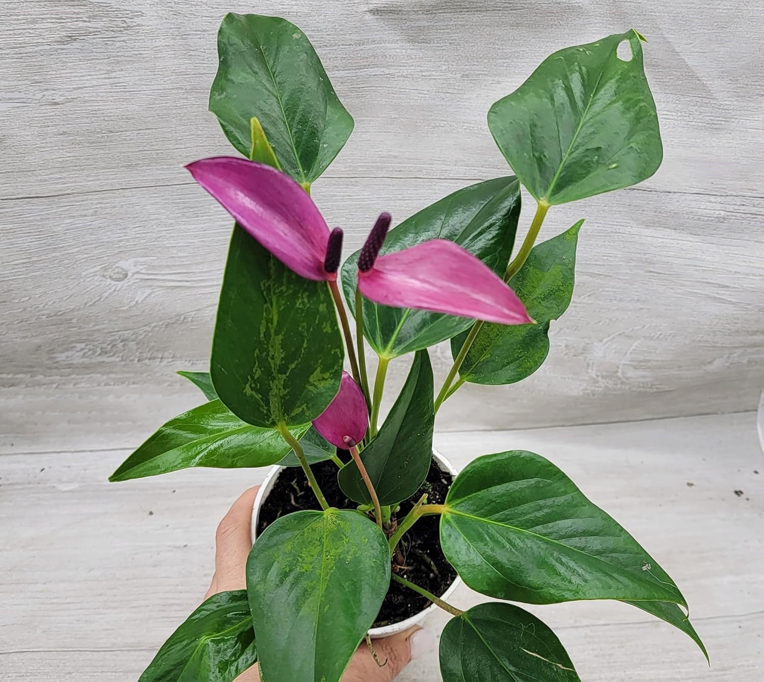A rare tropical beauty, the Anthurium Purple Andraeanum features glossy leaves and striking purple blooms. Grown in a 3-inch nursery pot, this exotic flowering plant makes a unique indoor centerpiece or thoughtful gift.